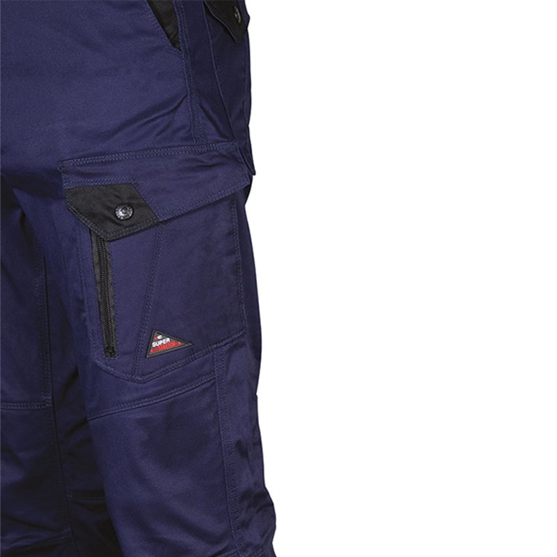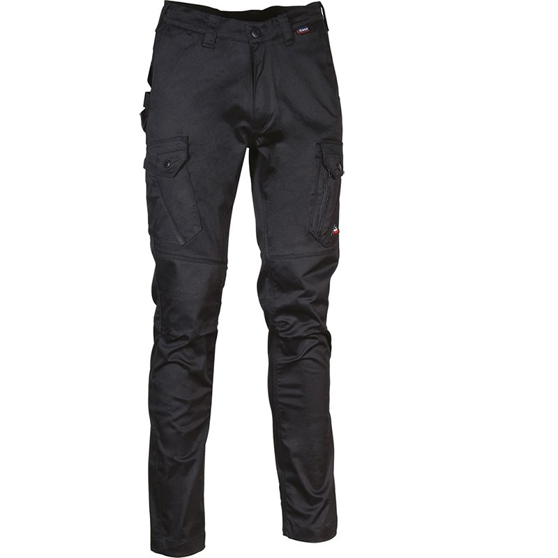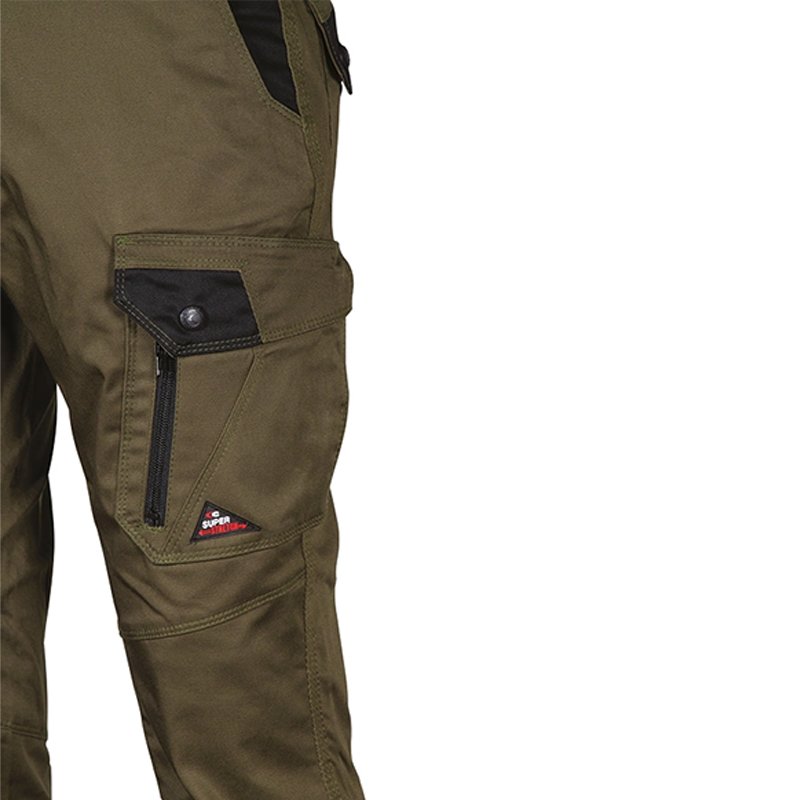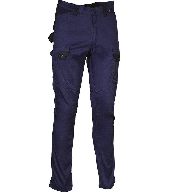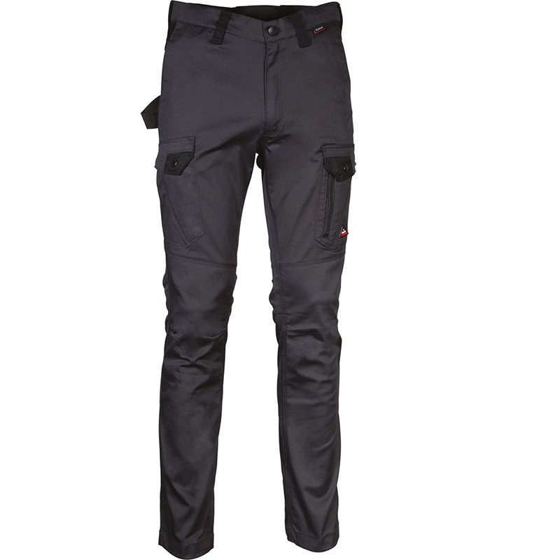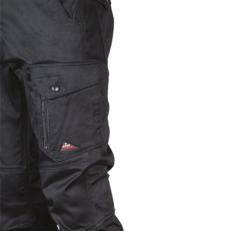 Description: 2 wide front pockets, double back pocket with flap closed with snap, hammer loop, knee and leg ergonomic design, right side pocket closed with snap, left side pocket with double opening (with snap and zip closure), fabric with high elastic perception.