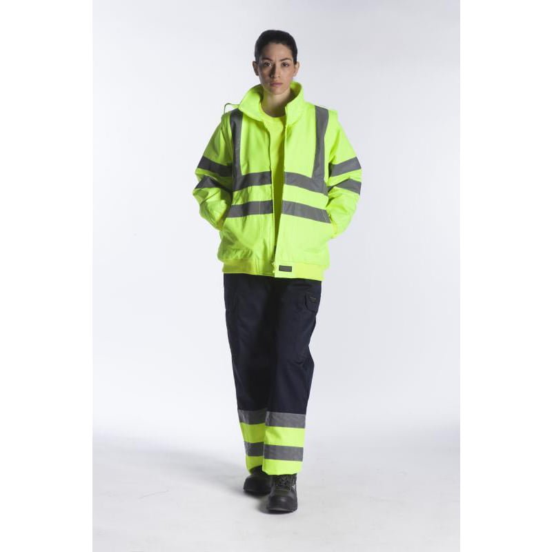 Jacket with removable sleeves , water proof , Hi visibility with reflective tapes 5cm , 2 outside pockets and 2 inside pockets , latex waist and on cuffs . Lining pollar fleece on body.