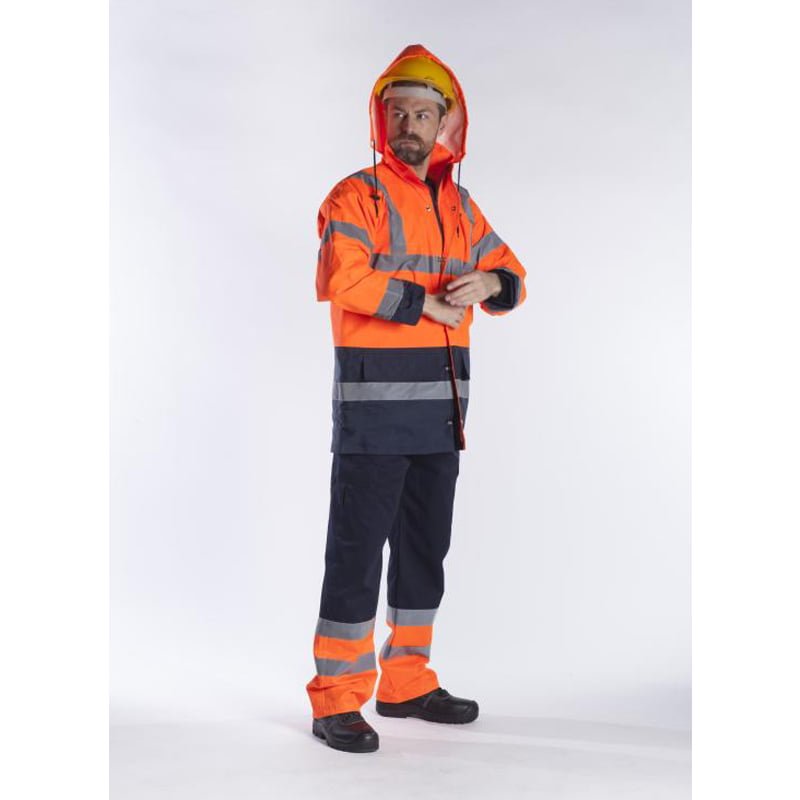 Jacket parka water proof Hi visibility with reflective tapes 5cm, with hood, 2 outside pockets and 1 inside pocket, latex inside on cuffs for better fit and tightness.