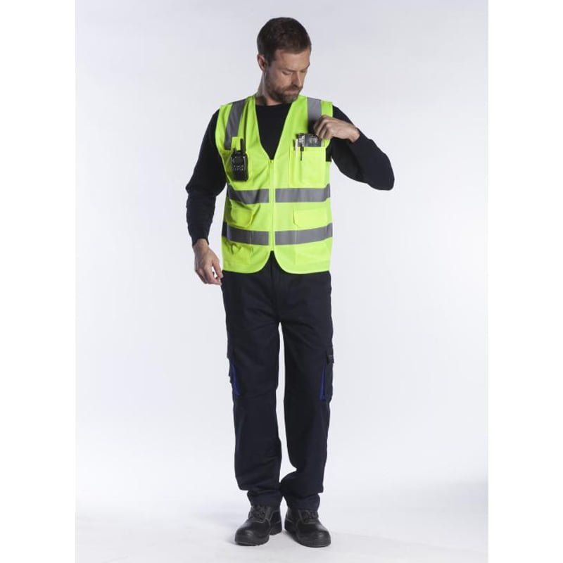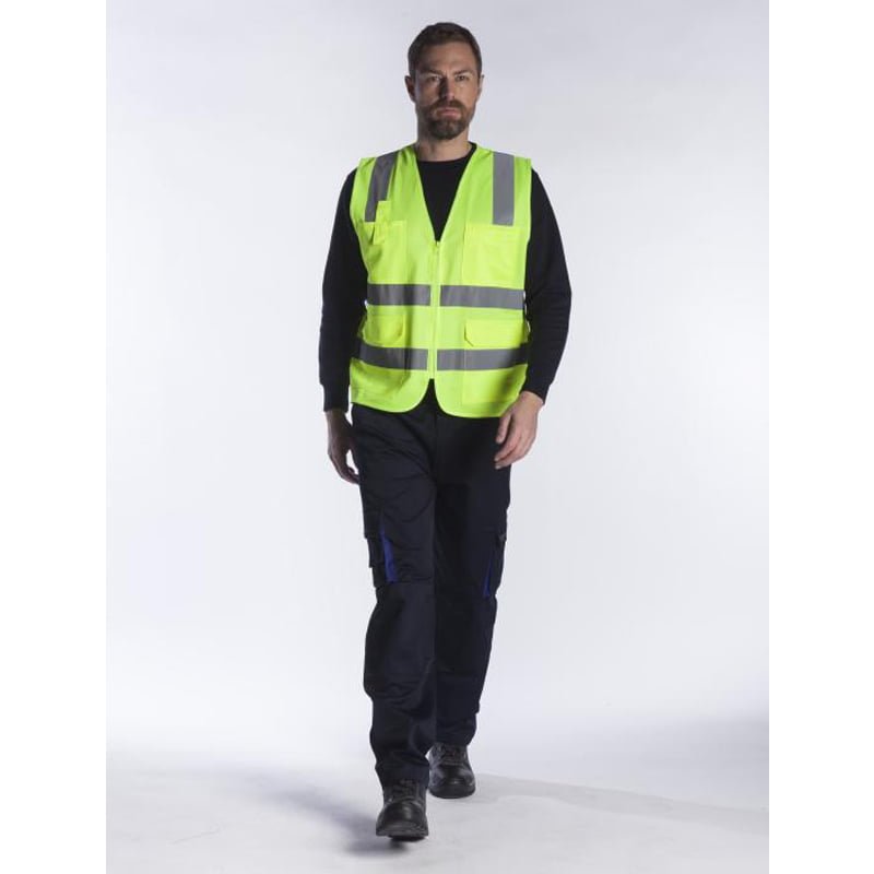 Hi visibility  vest with 5cm reflective tapes (horizontal and vertical) , central zipper and 4 front pockets.