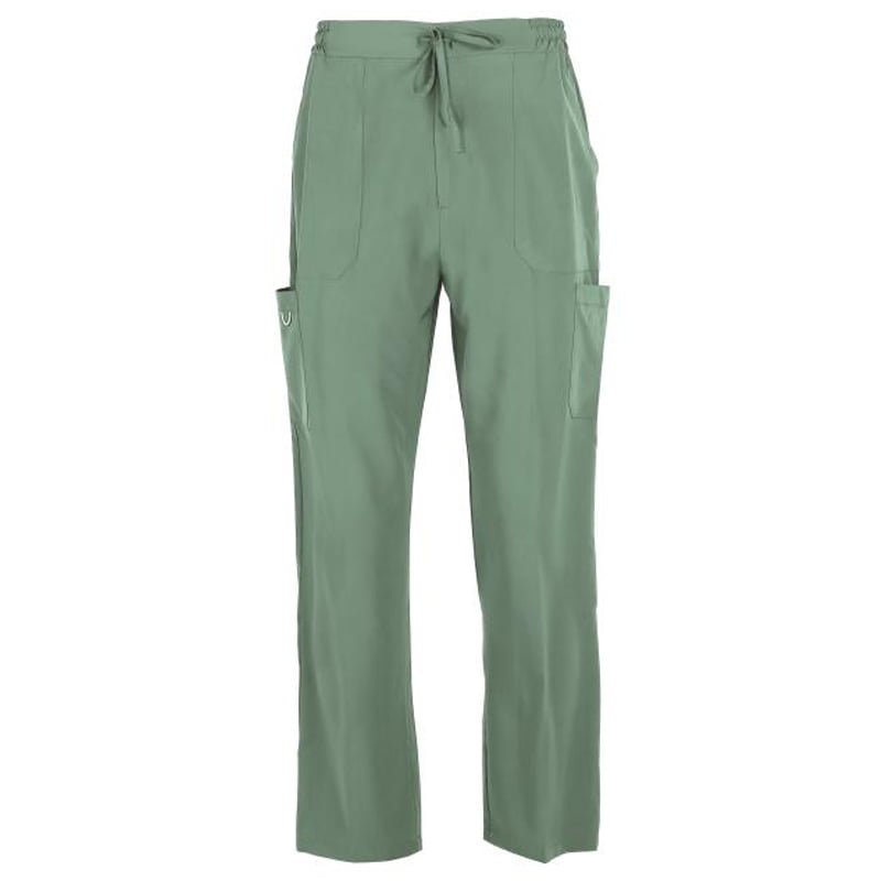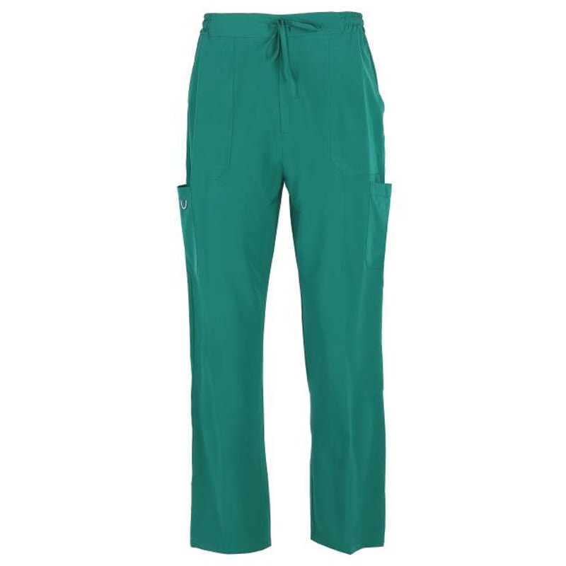 Medical stretch pants with four outside pockets, two on the side and elastic waist with drawstring.